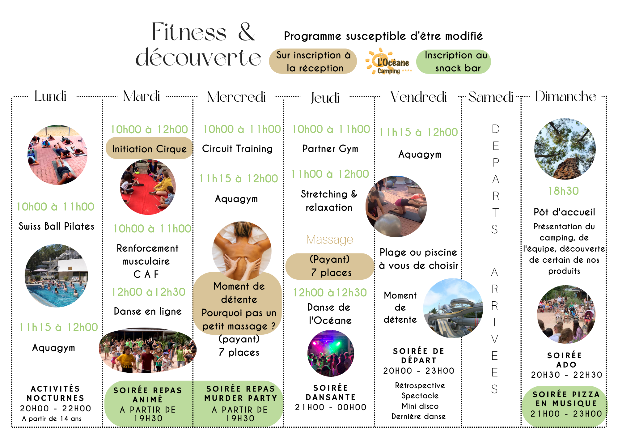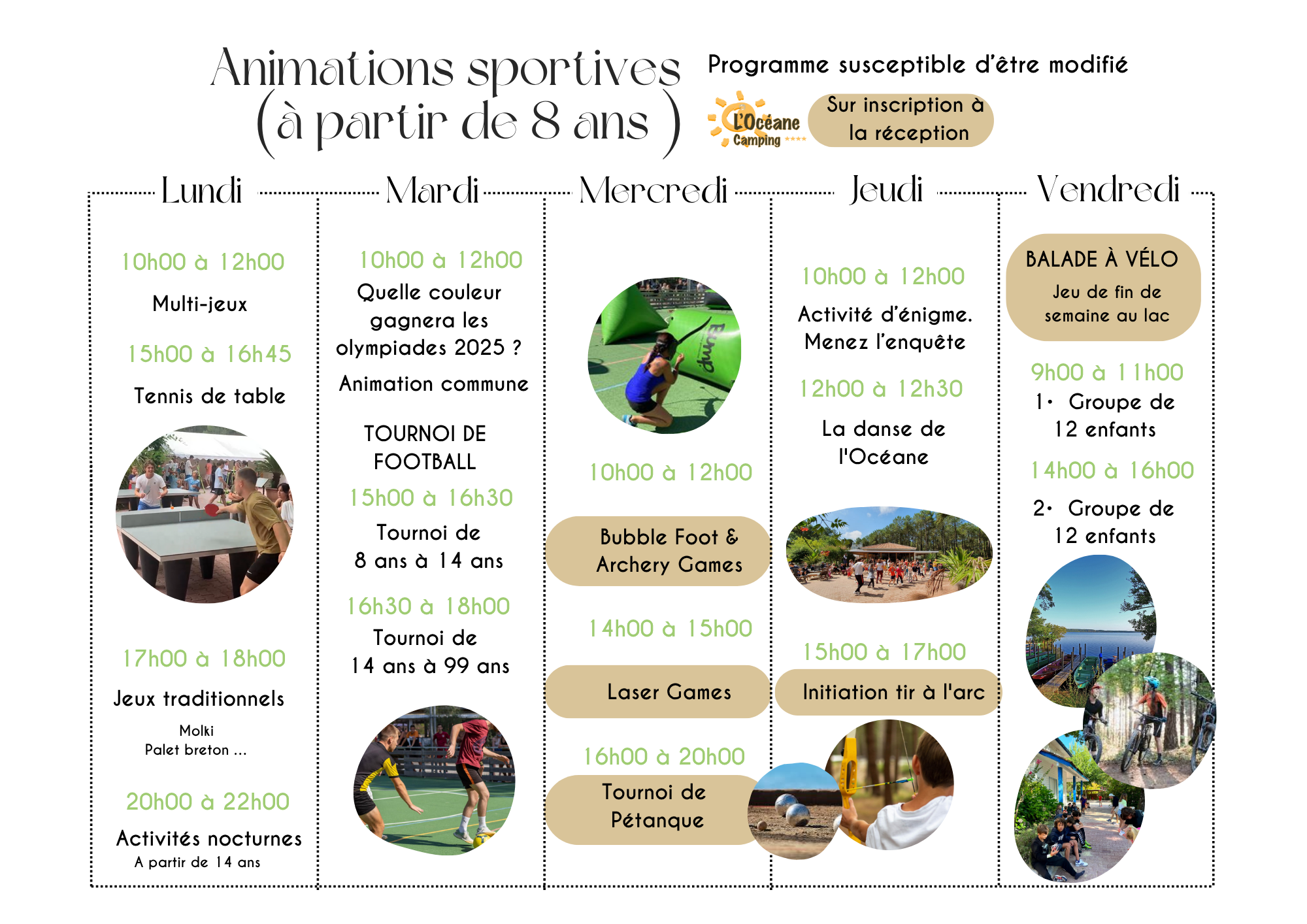 Venez vous divertir avec nos animateurs diplômés d’état, au programme: Chasse aux trésors, Tournois divers (Foot, Volley, Pétanque, Handball , etc.), initiation au Cirque et Tir à l’arc, sans oublier les activités sportives (Aquagym, Pilate, CAF etc …).