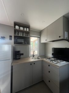 Tout d’abord, même si les mobil-homes sont bien équipés, prévoyez quelques produits ménagers (éponge, liquide vaisselle), même si le mobil-home dispose déjà d’une cuisine équipée avec micro-ondes, plaque de cuisson, réfrigérateur et vaisselle.